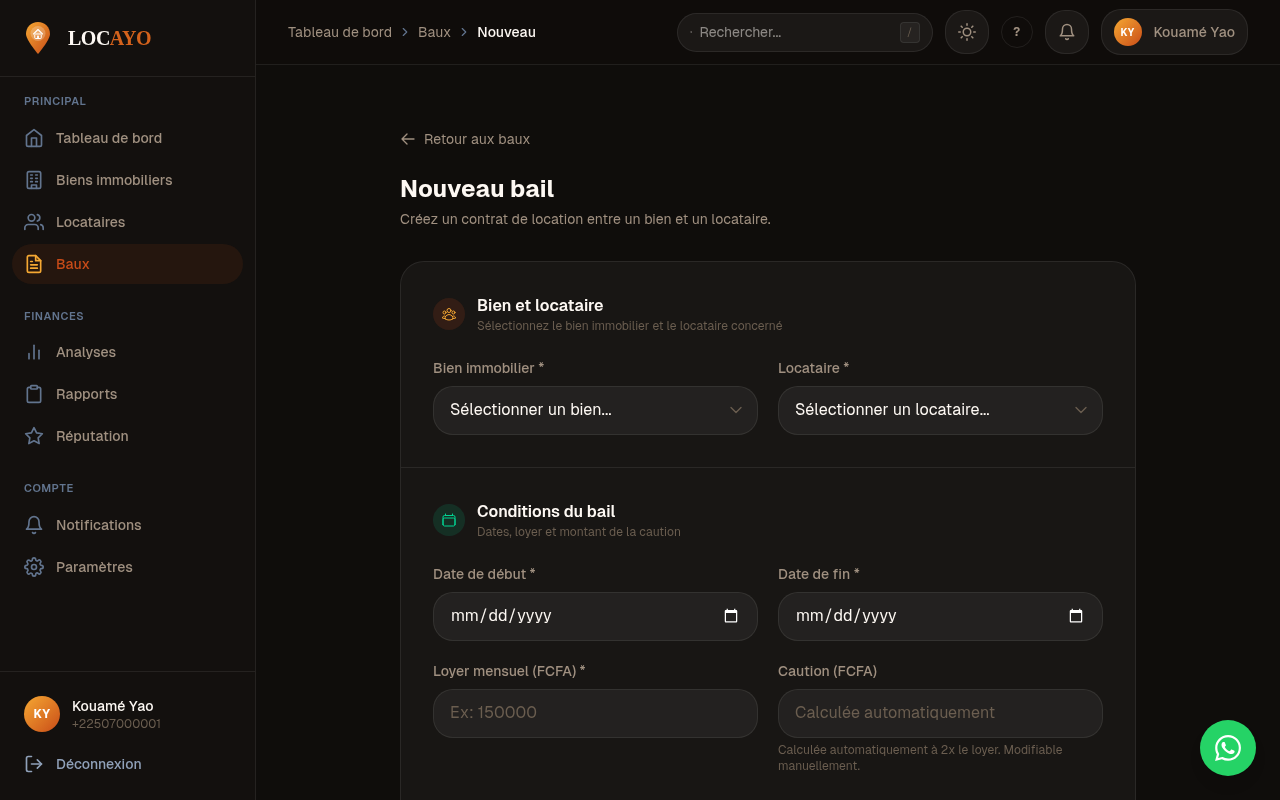 La creation d’un bail sur Locayo prend moins de 2 minutes. Le systeme genere automatiquement un contrat PDF conforme au droit ivoirien, pret a etre signe electroniquement.Prerequis