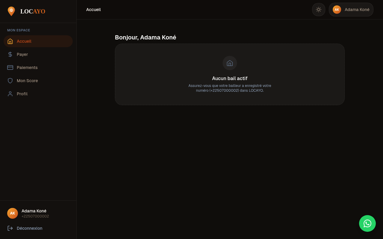 Un tableau de bord dedie ou le locataire voit son bail actif, son historique de paiements et son solde.