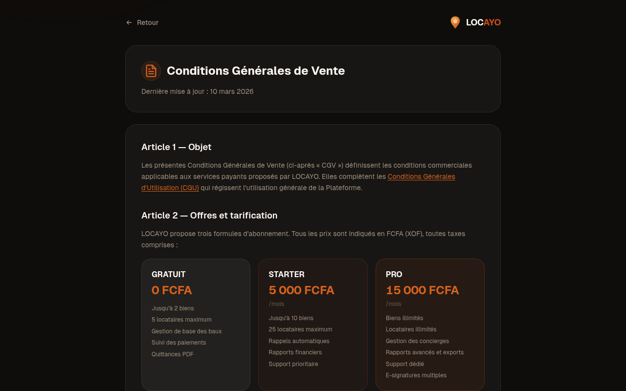 Locayo se reserve le droit de modifier ses tarifs. Toute modification sera communiquee aux utilisateurs avec un preavis minimum de 30 jours par notification dans l’application.Souscription et renouvellement
